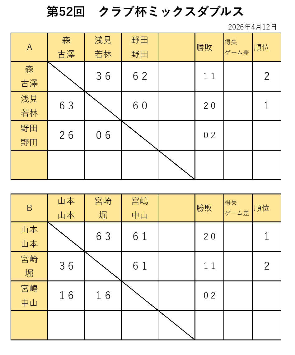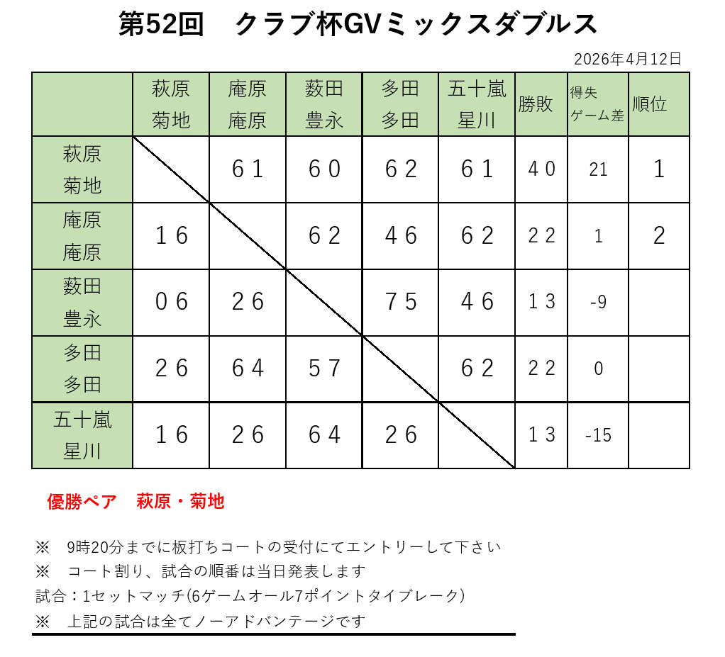 第52回クラブ杯ミックスダブルス 初日終了